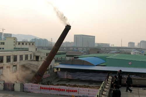 14:45,一陣脆響,煙囪完成了它的歷史使命,在空中劃過(guò)最后一道弧線,悠然倒地,沒(méi)有震耳的轟鳴,沒(méi)有強(qiáng)烈的震撼,輕煙散去,眼前豁然開(kāi)朗,市場(chǎng)這一瓶頸終于疏通。