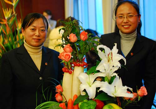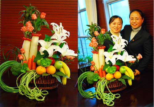 通過評委的綜合評審,無錫朝陽集團閻虹、呂雪芳用新鮮蔬果作為主材制作的插花作品—《愛的奉獻》斬獲二等獎,張雪鵝、朱霞制作的《碩果飄香》獲得優勝獎。