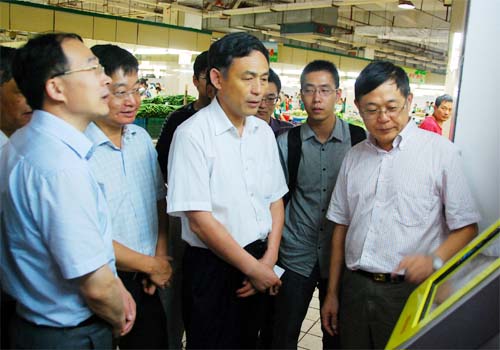 在朝陽農貿市場蔬菜溯源機終端前,南通客人詳細了解了溯源系統的使用情況及蔬菜溯源的整個運作流程,楊總親自進行了現場演示。隨著蔬菜條碼秤紙在掃描口的輕輕一掃,商品的品名、產地、供貨商等詳細信息隨即清晰地顯示在了屏幕上。來訪客人們還來到了蔬菜攤位前,隨機抽樣商品進行稱重,查看了條碼秤紙,并了解客戶會員卡的使用情況,對朝陽集團在蔬菜溯源體系建設上所取得的成果表示充分的肯定。