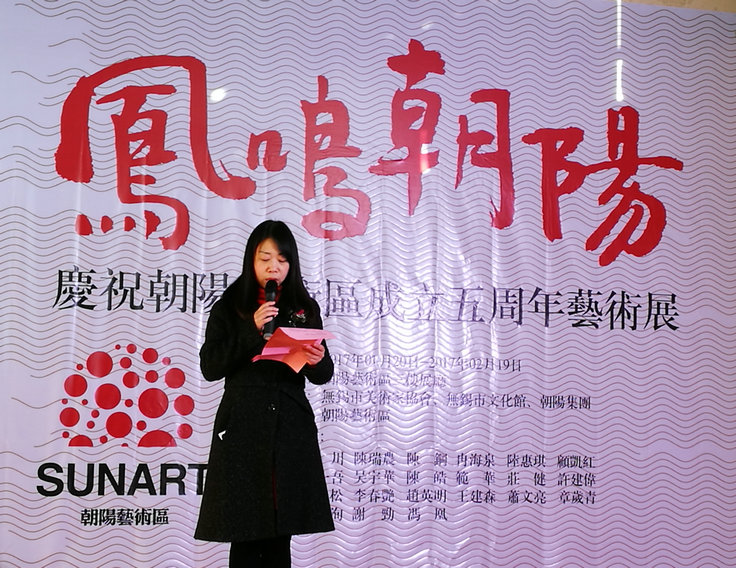 無錫朝陽集團董事長張君君首先致辭。她代表無錫朝陽集團向蒞臨藝術展的各位領導,各位嘉賓及各界朋友致以熱烈的歡迎和誠摯的問候!她回顧總結了藝術區(qū)五年來取得的豐碩成果。以國家一級美術師楊雨青大師為代表的一批無錫知名藝術家紛紛入駐朝陽藝術區(qū);一大批高質量、高品質的藝術作品從朝陽藝術區(qū)走出去,走出無錫城,走向全中國;一批優(yōu)秀藝術人才在這里得到精心的培養(yǎng),朝陽藝術區(qū)也從單一的創(chuàng)作模式,逐漸向集創(chuàng)作、展覽、制作、培訓等多元模式轉型,五年歷練已初具藝術生態(tài)圈的雛形。朝陽藝術家們的生花妙筆,成功打響了無錫“書畫之鄉(xiāng)”的美譽,更把朝陽藝術區(qū)推向了無錫文化藝術產業(yè)的新高地。最后,她預祝藝術展取得圓滿成功,并希望朝陽藝術家們再接再厲,創(chuàng)作出更多有分量的藝術佳作,為無錫增光,為朝陽增光!