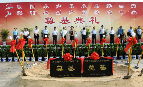 2017年7月26日上午,無錫朝陽農(nóng)產(chǎn)品大市場二期暨蘇南農(nóng)副產(chǎn)品物流中心奠基典禮在錫澄路280號工地現(xiàn)場隆重舉行。項目建設得到了無錫市委、市人大、市政府、市政協(xié)和市級各部門的高度重視,得到了區(qū)委、區(qū)政府和各級部門的大力支持。 出席慶典的主要領導有:無錫市副市長劉霞,梁溪區(qū)區(qū)長秦詠薪,產(chǎn)業(yè)集團董事局主席、黨委書記蔣國雄,市政府副秘書長糜君初、張千山,梁溪區(qū)人大主任鄒士輝,梁溪區(qū)政協(xié)主席陳錫明,市供銷合作總社理事會主任吳滿良,市糧食局副局長馬駿,梁溪區(qū)副區(qū)長朱剛,產(chǎn)業(yè)集團副總裁、蘇南物流公司董事長張曉耕,朝陽集團創(chuàng)始人張海良,天鵬集團董事長、總經(jīng)理馬南生,朝陽集團董事長、蘇南物流公司總經(jīng)理張君君等。 市級、區(qū)級有關部門領導,公安、消防、交警、城管、黃巷街道和莊前社區(qū)等領導也參加了奠基典禮。