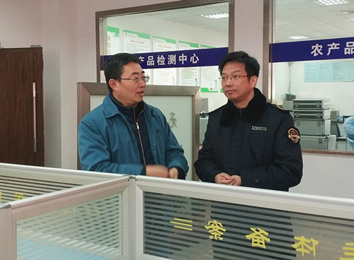 春節來臨前夕,1月29日,無錫市市場監督管理局胡副局長率梁溪區市管局、黃巷分局等有關同志到朝陽農產品大市場檢查工作。朝陽股份總經理朱健祥熱情接待了來訪領導。