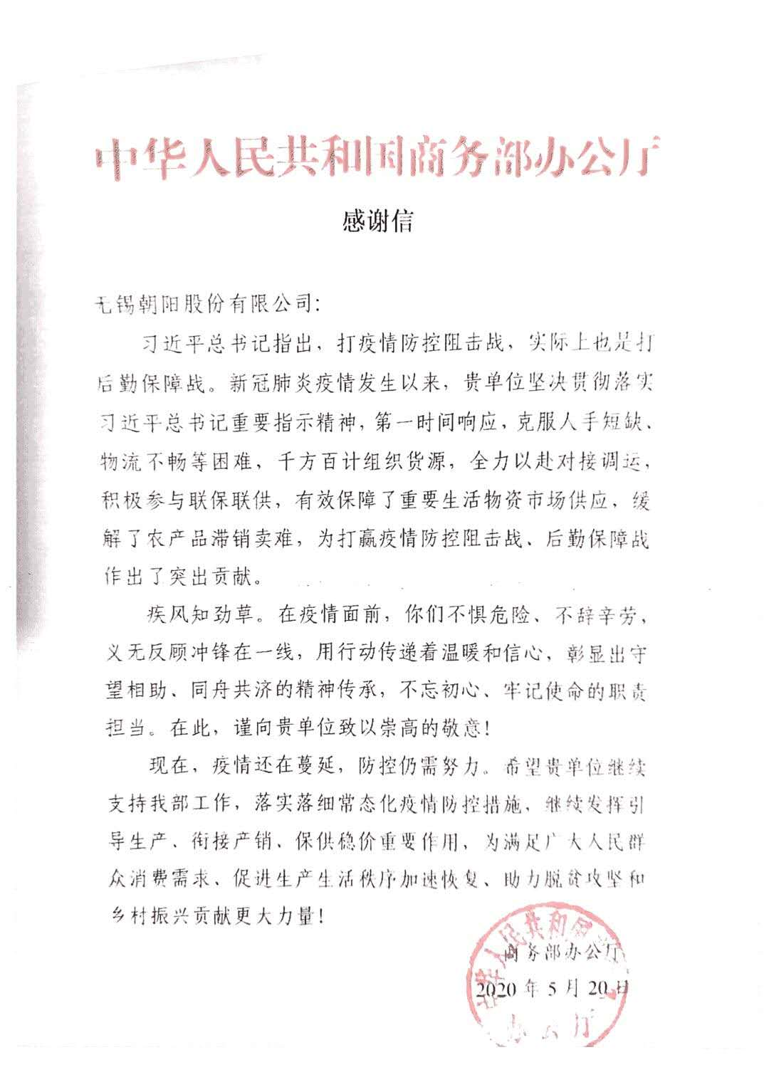 近日,中華人民共和國商務部向無錫朝陽股份有限公司發來感謝信。信中充分肯定了我公司作為農業產業化國家重點龍頭企業,在此次新冠肺炎疫情期間所做的工作,感謝朝陽農產品大市場、經銷商在組織貨源、對接調運、參與聯保聯供應、保障重要生活物資市場供應、緩解農產品滯銷賣難等方面做出的突出貢獻。