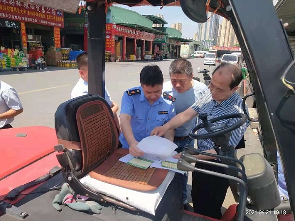 徐總向檢查人員詳細介紹市場的發展及日常管理工作,檢查人員針對市場客商所售商品以及索票索證工作進行了解,并當場驗證;對市場特種設備叉車臺賬、叉車的安全裝置現場查驗。