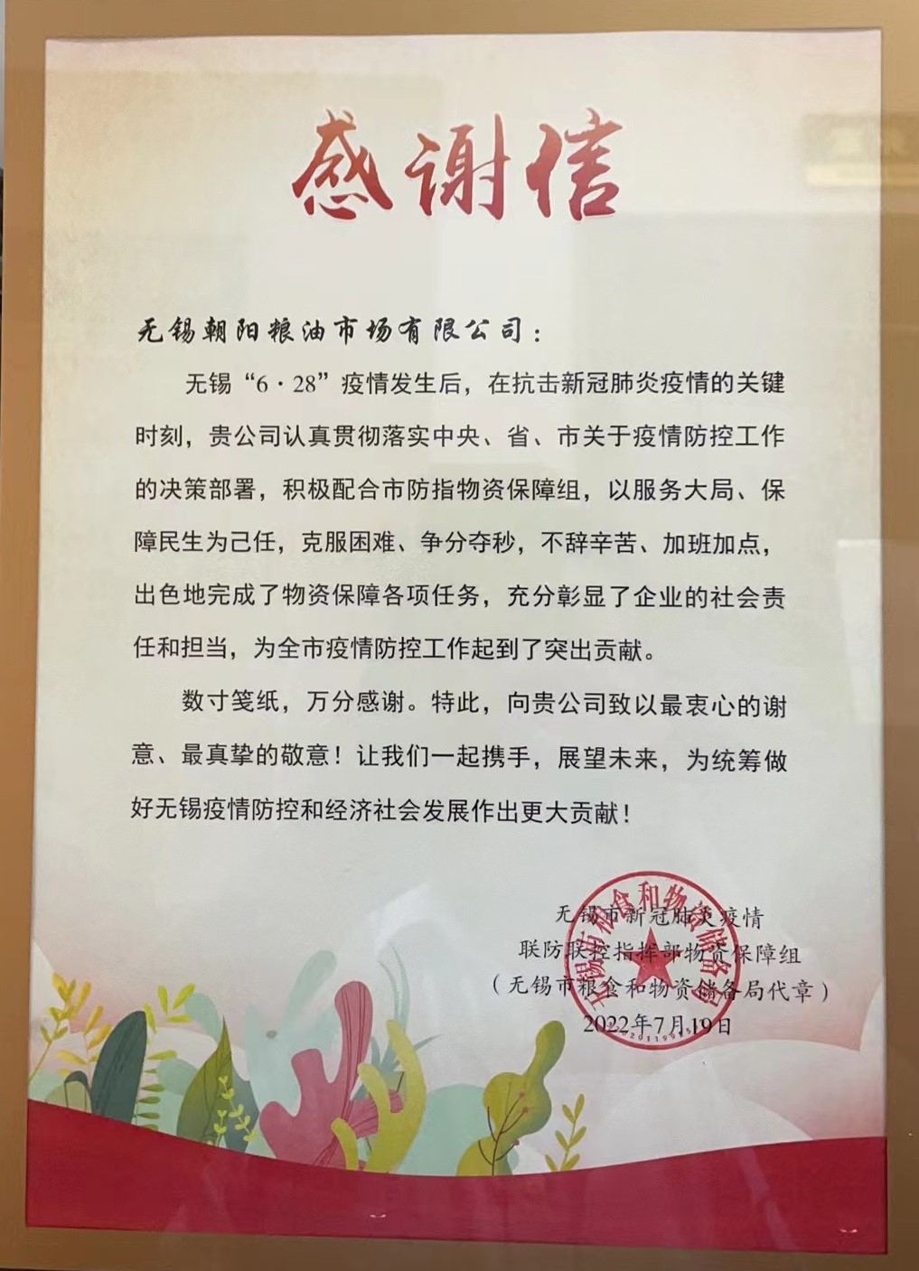 7月28日上午,無錫市糧食和物資儲(chǔ)備局物資儲(chǔ)備處陳界和副處長(zhǎng)代表無錫市新冠疫情聯(lián)防聯(lián)控指揮部物資保障處給糧油市場(chǎng)送來了感謝信,感謝糧油市場(chǎng)在無錫“6.28”疫情發(fā)生以來克服困難、爭(zhēng)分奪秒、不辭辛勞、加班加點(diǎn)、以保障民生為己任,出色完成了物資保障各項(xiàng)任務(wù),充分彰顯了企業(yè)的社會(huì)責(zé)任和擔(dān)當(dāng),為全市疫情防控工作起到了突出貢獻(xiàn)。(供稿人:奚赟賾 )