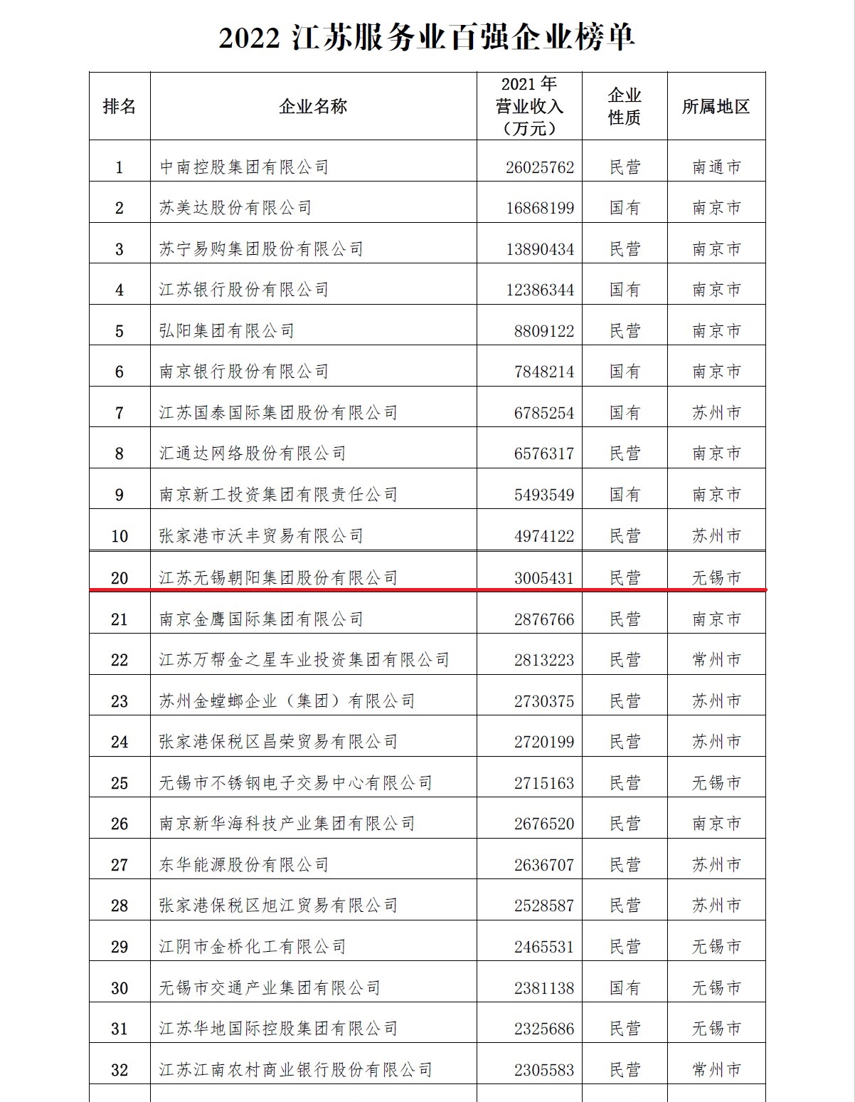 10月10日,江蘇省企業(yè)聯(lián)合會(huì)發(fā)布2022江蘇百?gòu)?qiáng)企業(yè)和服務(wù)業(yè)百?gòu)?qiáng)企業(yè),涵蓋國(guó)有企業(yè)和民營(yíng)企業(yè)。江蘇無(wú)錫朝陽(yáng)集團(tuán)股份有限公司分別位列“江蘇百?gòu)?qiáng)企業(yè)榜單”第78位、“江蘇服務(wù)業(yè)百?gòu)?qiáng)企業(yè)榜單”第20位。 統(tǒng)計(jì)顯示,百?gòu)?qiáng)企業(yè)入圍門(mén)檻為270.51億元、比上年提高76.91億元。服務(wù)業(yè)百?gòu)?qiáng)企業(yè)平均規(guī)模為241.35億元。全省53家企業(yè)入圍2022中國(guó)服務(wù)業(yè)企業(yè)500強(qiáng),比上年增加1家。