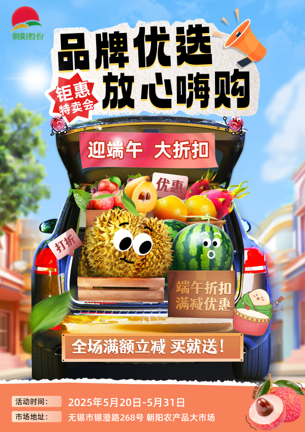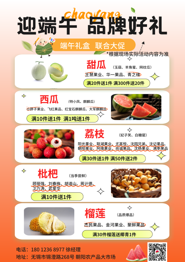 隨著端午佳節的臨近,瓜果的香味漸漸彌漫,朝陽水果市場已為您備好了滿滿的端午驚喜。荔枝、枇杷、榴蓮、西瓜、甜瓜......要買節日走親訪友的禮盒饋贈,就到朝陽水果市場,優惠促銷趕早來采購!