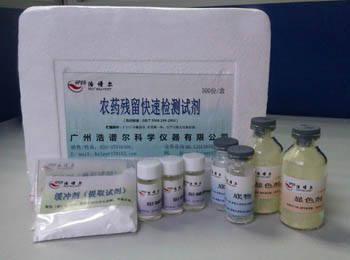 配合農藥殘留快速檢測儀使用,符合GB/;448-2001標準,組成部分:膽堿酯酶、顯色劑、底物、緩沖液,約500次檢測用量